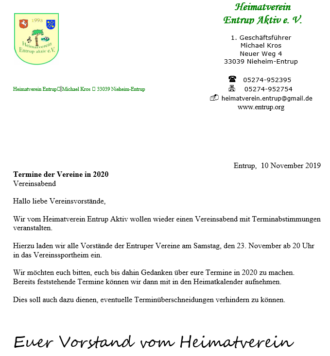 Eingeladen ist der Vorstand des Heimat- und Schützenvereins, der FFW Entrup, sowie der Ortsausschuss.